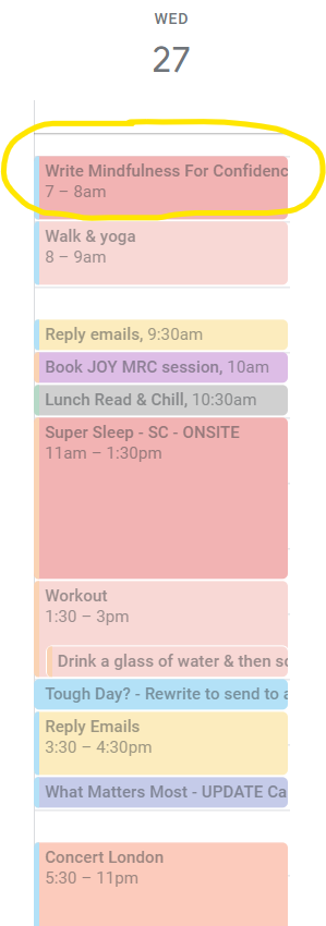 Book (protect) a 1 hour block into your calendar; name the task you will be working on (my calendar from Wed last week below, I’ve circled my Deep Work focus hour.) After booking a holiday you start preparing for it consciously and unconsciously. When a task is defined very clearly it’s much easier for our brain to start and complete.